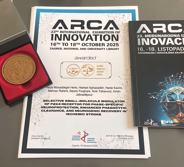 این تیم با ارائه اختراعی نوآورانه در حوزه پزشکی (نوروساینس) و داروسازی با عنوان «تعدیل کننده انتخابی مولکولی کوچک گیرنده P2X4 برای محافظت عصبی مرحله ویژه، پاکسازی فاگوسیتیک پیشرفته و بازیابی نوروژنیک در سکته مغزی ایسکمیک» مفتخر به دریافت مدال طلای جهانی بیست و سومین دوره مسابقات اختراعات و نمایشگاه بین المللی و تخصصی زاگرب کشور کرواسی ARCA 2025 شد.