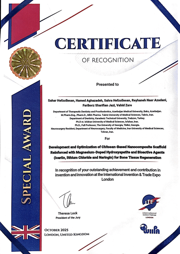 مهندسی بافت استخوان (BTE) علم مواد زیستی، زیستشناسی سلولی و مهندسی زیستپزشکی را برای پرداختن به چالشهای بازسازی استخوان در نقصهای با اندازه بحرانی ادغام میکند. پیوندهای استخوانی سنتی با محدودیتهایی مانند بیماری محل اهدا و رگزایی ناکافی مواجه هستند که نیاز به راهحلهای پیشرفته زیستتقلید را ضروری میکند. این اختراع یک داربست نانوکامپوزیتی جدید مبتنی بر کیتوزان و سایر مواد زیست فعال خاص را معرفی میکند که با هیدروکسی آپاتیت غنیشده با منیزیم (Mg-HAp) آلاییده شده و با عوامل زیستفعال – ایکارین، لیتیوم کلرید و نارینژین – تقویت شده است تا تقویت استخوان را بهبود بخشد. هدف این داربست تقلید از ماتریکس خارج سلولی (ECM) استخوان، ارائه پشتیبانی مکانیکی، القای استخوانی، هدایت استخوانی و رگزایی است. هدف اصلی این اختراع ، توسعه و بهینهسازی یک داربست نانوکامپوزیتی مبتنی بر کیتوزان حاوی هیدروکسی آپاتیت آلاییده شده با منیزیم (Mg-HAp) و مولکولهای زیست فعال (ایکارین، لیتیوم کلرید و نارینژین) برای افزایش تقویت استخوان است. این مطالعه با بهرهگیری از تکنیکهای پیشرفته ساخت و پیشنهاد بهبودهای هدفمند، به دنبال بهبود کیفیت و کمیت استخوان بازسازیشده است و جایگزینی پایدار برای پیوندهای معمولی ارائه میدهد. این تحقیق، با هدف نهایی کاربردهای بالینی فک و صورت و ارتوپدی، اثربخشی داربست را از طریق مطالعات آزمایشگاهی (in vitro) و درون تنی (in vivo) تأیید خواهد کرد.